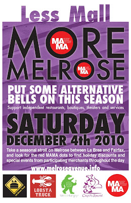 Take a seasonal stroll on Melrose between Fairfax and La Brea and look for the red MAMA dots to find holiday discounts and special events from our neighbors this Saturday December 4th 2010